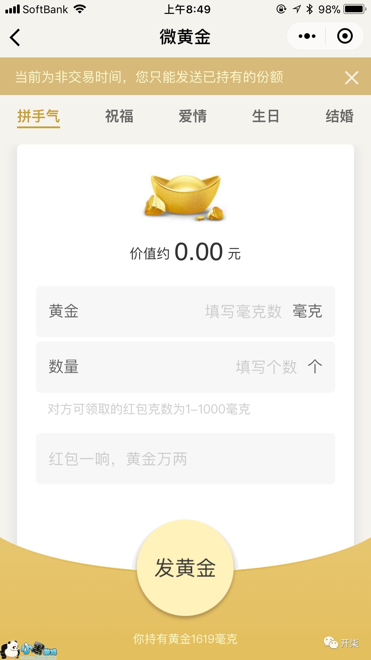 随后,腾讯黄金红包在情人节正式上线,并历经了各种版本的迭代,目前,黄金红包已经搞了不少的场景,也已经比较成熟了。比如,此前,微信红包只能在“微黄金”公众号中发送,现在则推出了“微黄金”小程序,体验好了很多,唤出也更方便了。