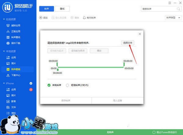 3、打开制作铃声页面之后,点击“选择文件”来选择已下载的您喜欢的铃声。
