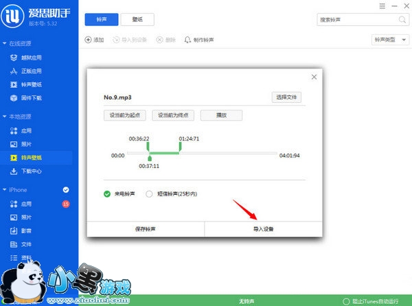 5、确定好铃声之后,直接点击下方“导入设备”就可以直接把自己制作的铃声导入到您的设备中。