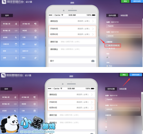 6.在弹出的手机模拟界面中,点击“开始时间”,然后在其右侧会弹出“日期类型”,将日期类型勾选为“年-月-日 时:分”。最后点击保存并启用。