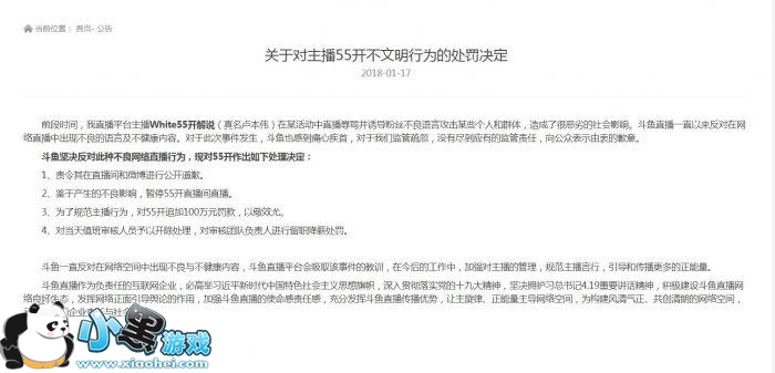 前段时间,我直播平台主播White55开解说(真名卢本伟)在某活动中直播辱骂并诱导粉丝不良语言攻击某些个人和群体,造成了很恶劣的社会影响。斗鱼直播一直以来反对在网络直播中出现不良的语言及不健康内容。对于此次事件发生,斗鱼也感到痛心疾首,对于我们监管疏忽,没有尽到应有的监管责任,向公众表示由衷的歉意。