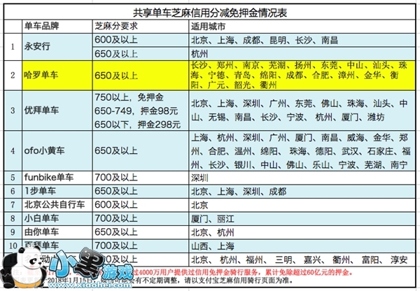 哈罗单车本次新增的免押金城市有:成都、合肥、绵阳、青岛、漳州、金华、衡阳、广元、衢州、韶关等,凡是芝麻分在650分以上的用户均可免押金骑行。