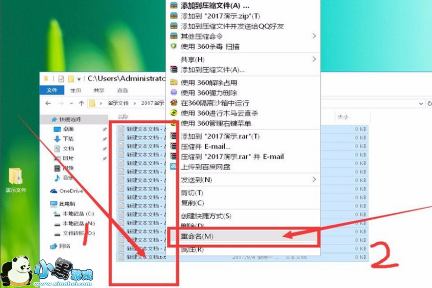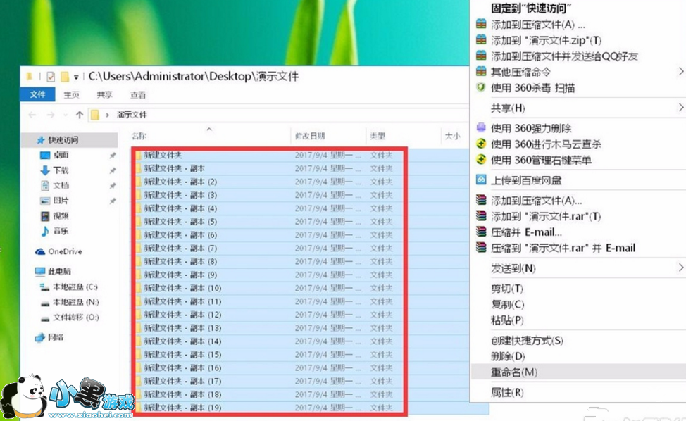 2、全选之后,在选中的地方单击右键,选择重命名,如图,