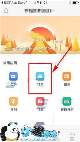 1)打开钉钉,点击屏幕下方的【工作】,然后进入【钉盘】;(如下图)