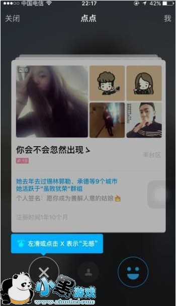 2、在这里你会看到各种陌陌的名片,左滑或者点击叉号表示无感!
