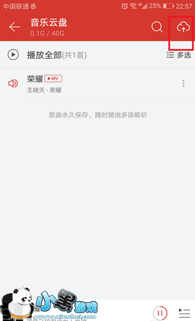 3、进去音乐云盘界面,可以看到已经上传的歌曲,点击右上方上传图标,如下图所示: