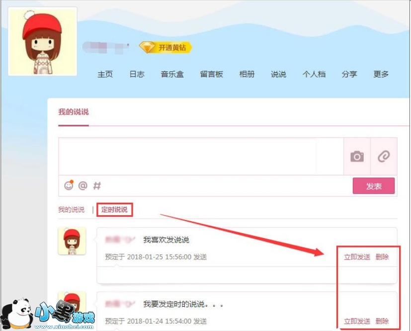 6、我们也可以来查看定时说说,点击“定时说说”,可以看到我们所有设置好的定时发送的说说,我们可以进行检查一下,同时可以选择相关删除和立即发送功能。