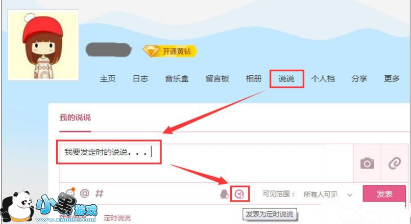 2、进入QQ空间后,切换到说说一栏,然后在说说发布内容框里输入内容,下面有个“定时说说”选项,点击它,如图。
