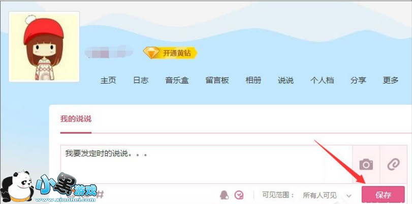5、确定后,我们会回到说说页面,我们看到我们的定时图标是亮的的,然后点击“保存”即可,这样我的定时说说就设置成功了。