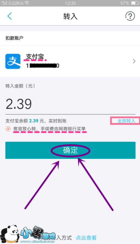 4、在转入中,选择扣款账户为本人支付宝即可,下面会显示支付宝余额(2.39元),点击全部转入,再点确定,如图所示;另外,手续费是否全免下面有提示。