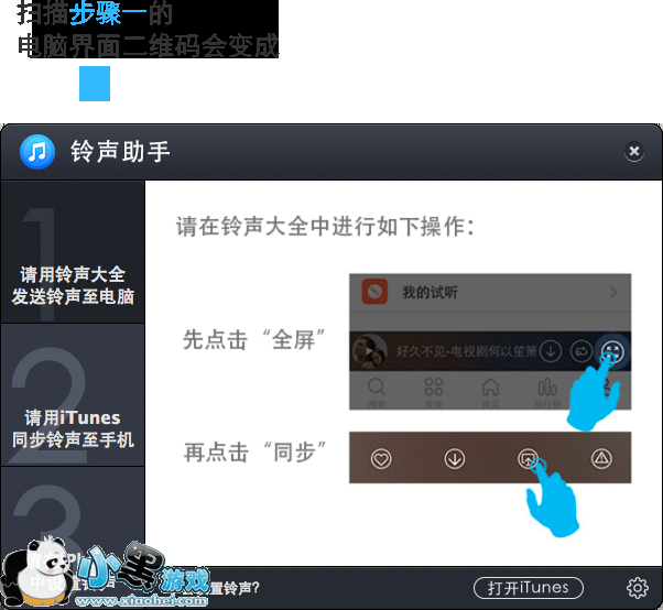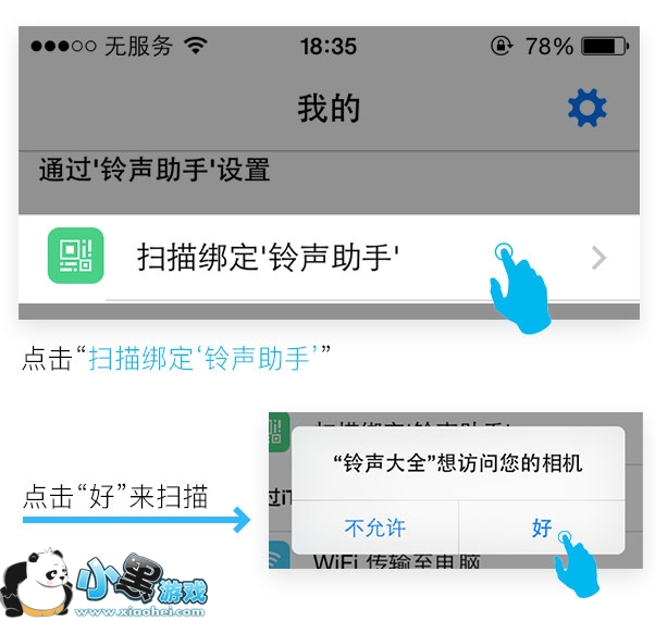 3、安装下载好之后,需要扫描绑定铃声助手,之后就不一一陈述,大家就根据图片的教程来完成设置就可以了。