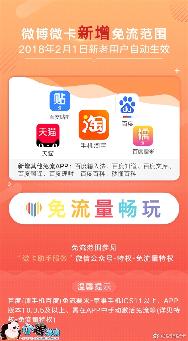 1月29日,微博微卡官方宣布,从2018年2月1日起,微博微卡新增百度贴吧、天猫、手机淘宝、手机百度、百度糯米、百度输入法、百度知道、百度文库、百度翻译、百度理财、百度百科、秒懂百科等App免流服务。