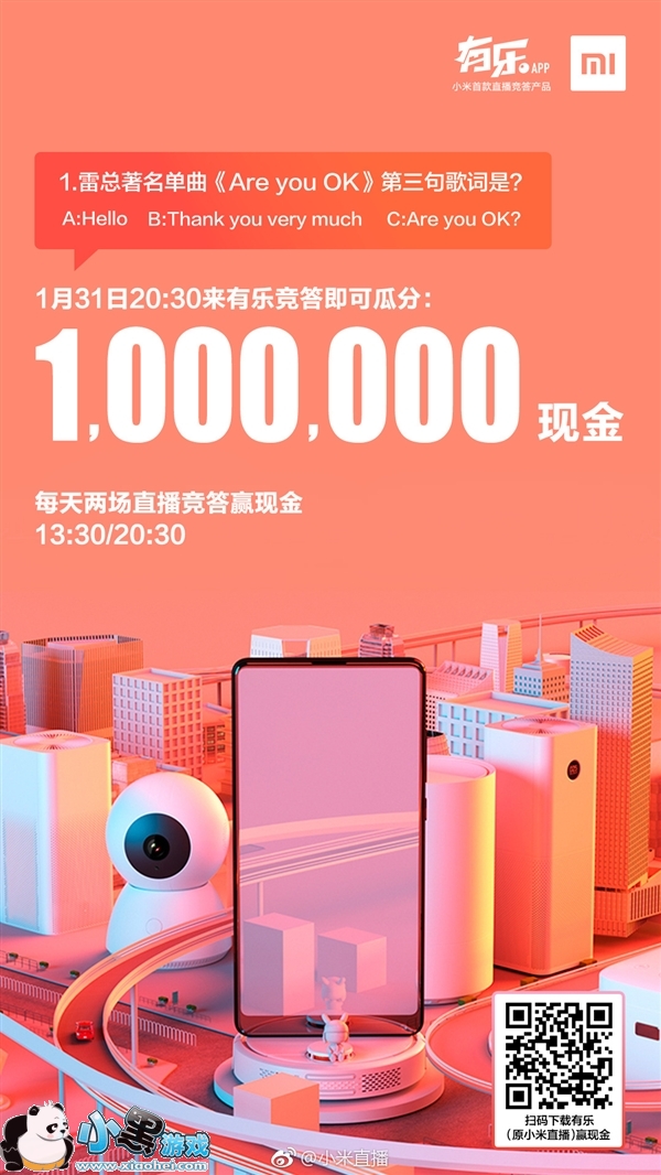 1月31日,小米有乐还将在20点30分开启百万现金专场,100万奖金等待瓜分。