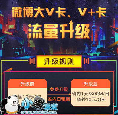 省内1天1元/800M,省外10元/GB,现有微博大V卡和大V+卡用户可免费申请,下月1号生效。