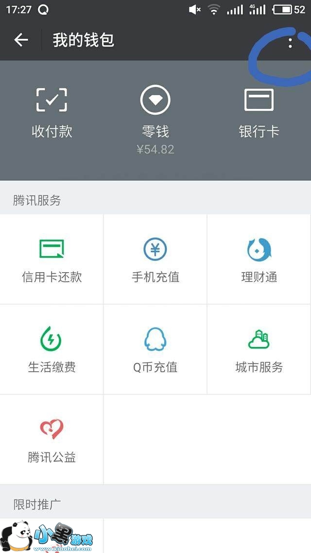1、进入微信中的“钱包” , 点击右上角三小点。