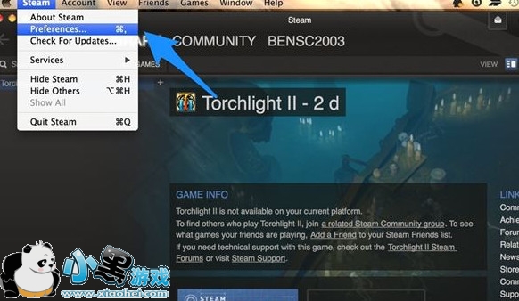 在 Steam 的菜单中选项中,点击打开 Preferences 选项,如图所示