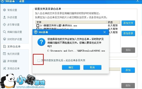 3、在添加是记得将“文价内容发生变化后此白名单失效”前面把勾去掉,然后点击“确定”按钮;