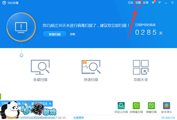 1、首先我们打开360杀毒,然后在右上方可以看到“设置”按钮,打开它;