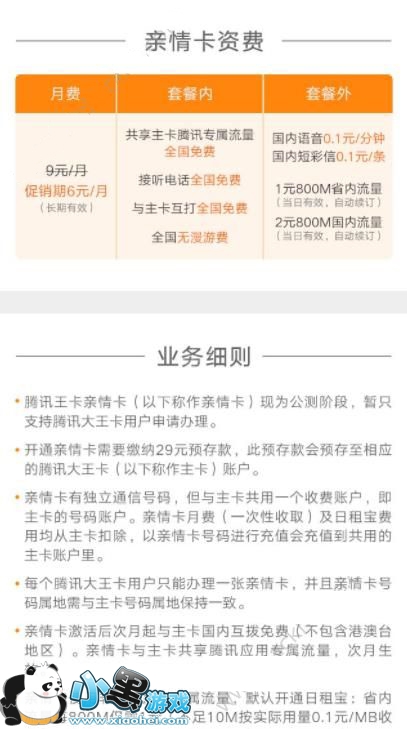 开通亲情卡需要缴纳29元预存款,此预存款会预存至相应的腾讯大王卡(主卡)账户。亲情卡有独立通信号码,但与主卡共用一个收费账户,即主打的号码账户。亲情卡月费(一次性收取)及日租宝费用均从主卡扣除,以亲情号码进行充值会充值到共用的主卡账户里。亲情卡激活后次月与主卡国内互拨免费(不包含港澳台地区)。亲情卡与主卡共享腾讯应用专属免流,次月生效。