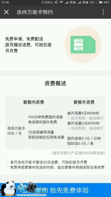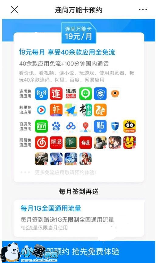 据了解,连尚万能卡月租费为19元,套餐内包含1GB的全国流量+100分钟的国内语音通话。在超出范围的语音资费为0.1元/分钟,短彩信资费为0.1元/条;超出范围的流量资费为1元/800M省内,2元/800M国内,仅限当日有效,自动退订。这款套餐的特色在于签到就赠送指定应用免流量,例如时下使用率比较高的阿里系APP:优酷、虾米、书旗;百度系APP:爱奇艺、手机百度、百度贴吧等等。原来“连上”的奥秘在于此,通过签到就可以免费连上很多种免流APP。除此之外,这款套餐是可以在客户端上预约申请,免费申请、免费配送十分方便,在优惠力度上再赠送首月免费体验。