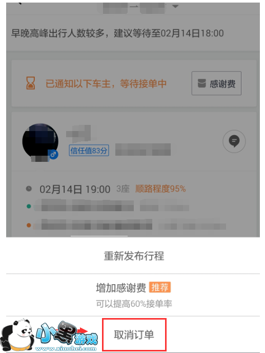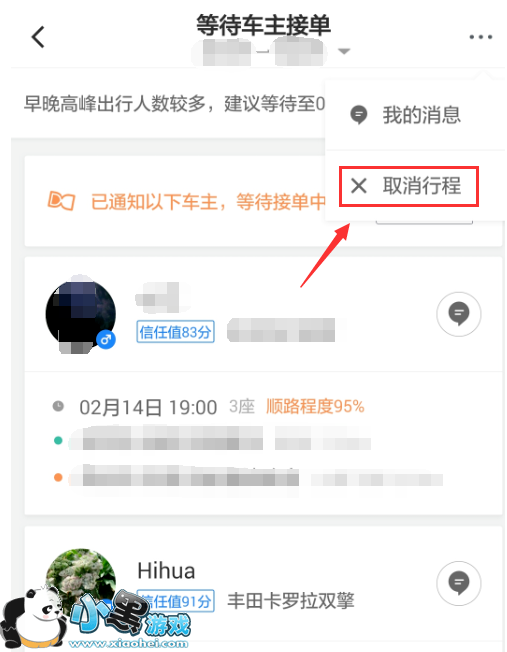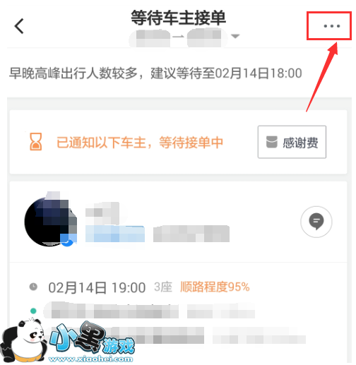 2、目前的顺风车行程正常等待车主接单的情况下,点击右上角的三个点图标。