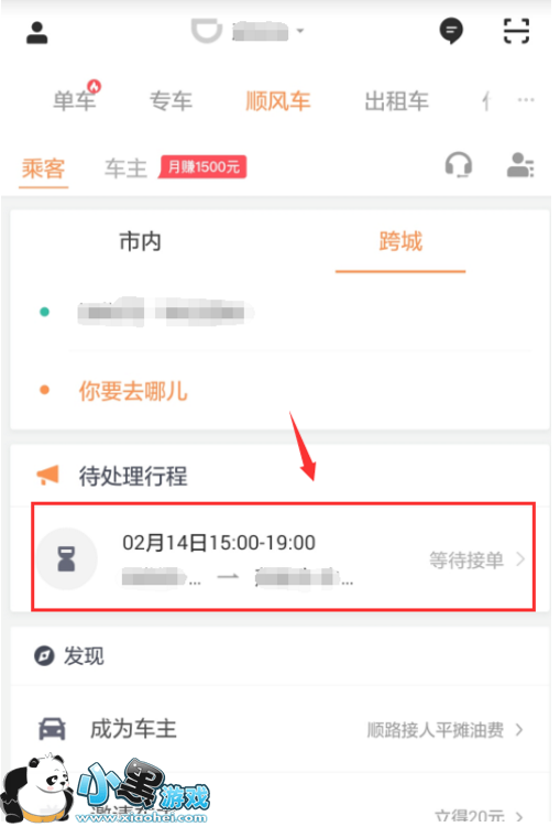 1、打开滴滴出行app,登录账号,默认跳到顺风车频道,可以看到自己待处理的行程,点击进入,