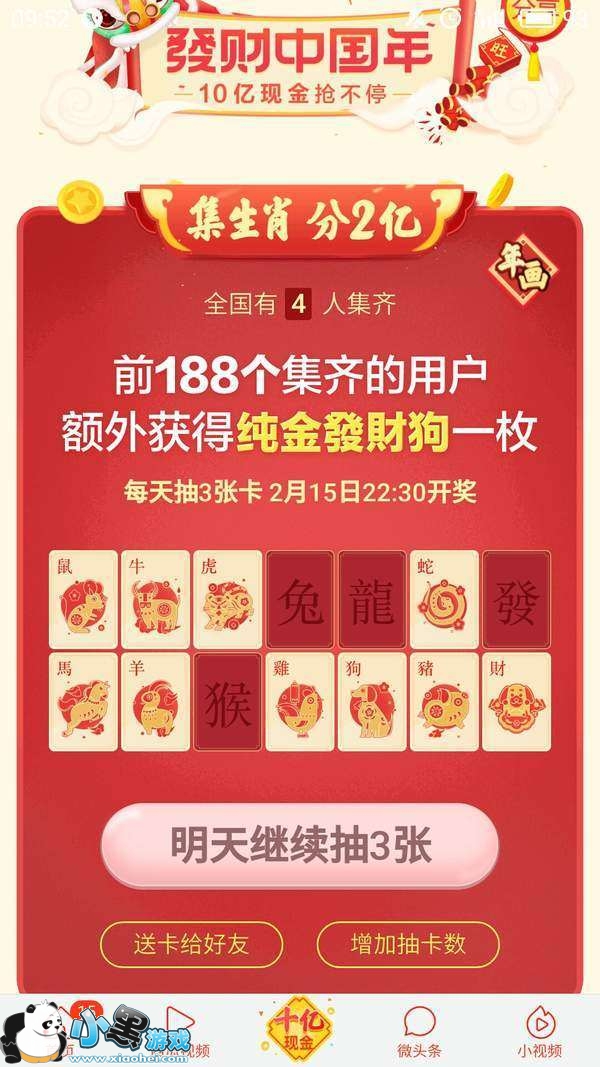 今日头条目前推出一款集卡活动,只要集齐14张生肖卡就可以获得瓜分2亿奖金的机会,我们如果有多余的卡牌还能与好友交换,但是最近有朋友反映无法收到好友的分享,那么这是为什么呢?下面就让我们一起来看看吧。