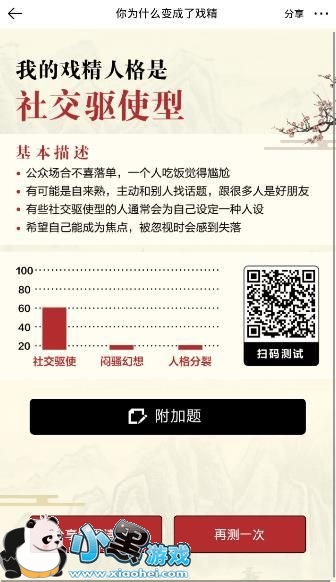 做完5道题目之后,即可得出测试结果。这个测试结果可以分析出你的戏精人格是什么哦。你可以将结果截图,分享给你的好友。