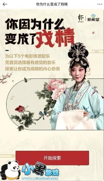 进入到活动测试页面以后,点击页面下方的“开始探索”按钮就可以开始测试了。你需要为5个电影场景配乐,凭直接选择最有感觉的营业,可以探索出你成为戏精的内心恐惧哦。