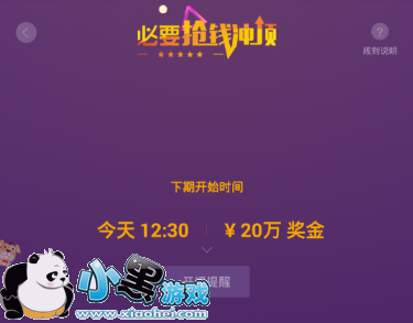 每天2场答题,首场12:30,20万元奖金,晚场22:00,50万元奖金。