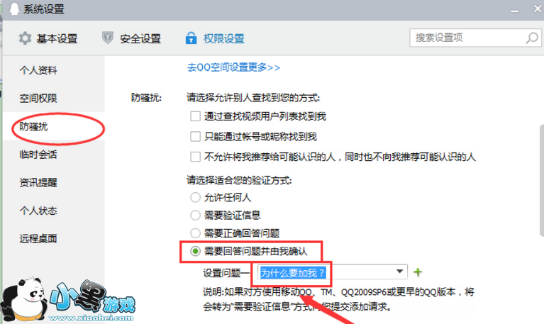 4、设置别人加好友时的验证方式为需要回答问题并由我确认,如下图所示,