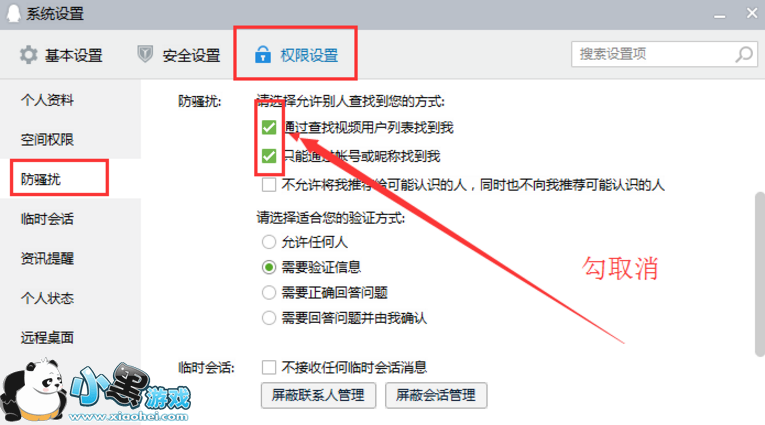 3、进到权限设置面板,选择防骚扰中的请允许别人查找您的方式,将勾去掉,