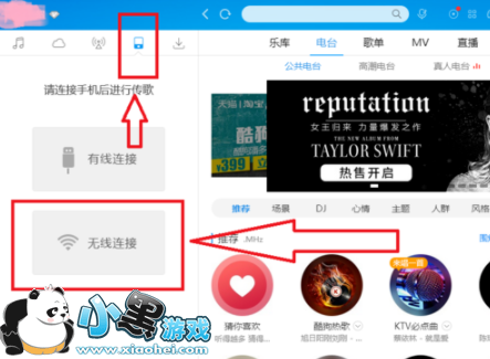 1.打开电脑端酷狗,点击手机图标,有提示数据线连接或者无线网连接。选无线网连接。会出现二维码用于扫描。