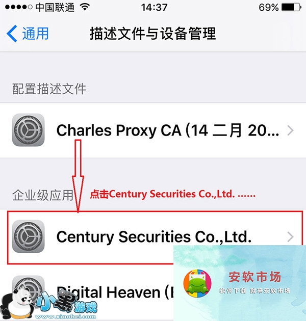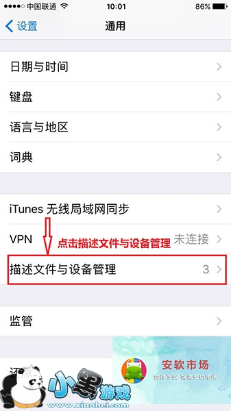 1、然后在设备中点击【设置>>通用>>描述文件】(iOS9上叫“描述文件”, iOS10上叫“设备管理),,找到刚才同名的描述文件