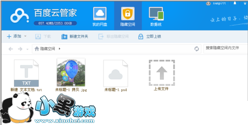 8、现在点击:“隐藏空间”进入查看刚才已上传的文件,对于图片可以缩略图预览。同时我们要创建文件夹,将文件进行分类整理。