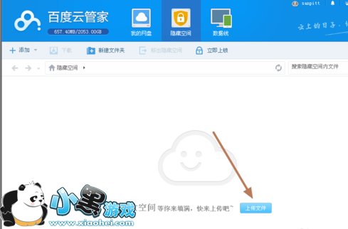 4、设置完成之后就可以上传文件到隐藏空间了,也可将我的网盘中已上传过的文件移动到隐藏空间。点击:“上传文件”。