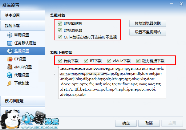 2、选择我的下载→监视设置,勾选监视对象与监视下载类型中的所有选项。