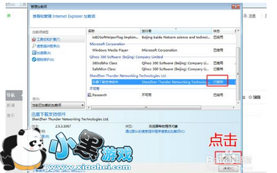 6.在弹出的对话框中选择“工具栏和加载”,并在右侧界面中将“迅雷下载支持组件”的“禁用”选择为“启用”。