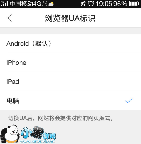 4、在浏览器UA标示界面选择“电脑”选项即可;