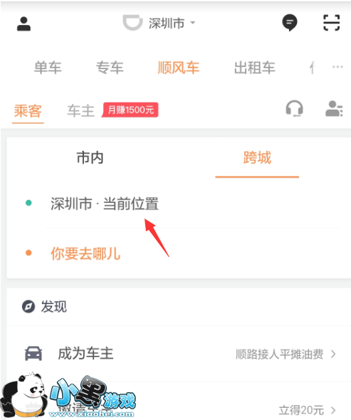 1.在手机上打开滴滴出行app,在完成登录的情况下来到顺风车跨城选项中,点击当前位置设置出发地址。