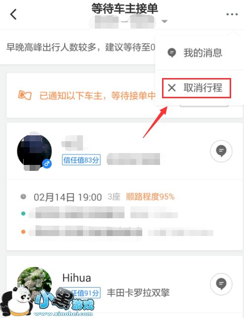 3.目前的顺风车行程正常等待车主接单的情况下,点击右上角的三个点图标。