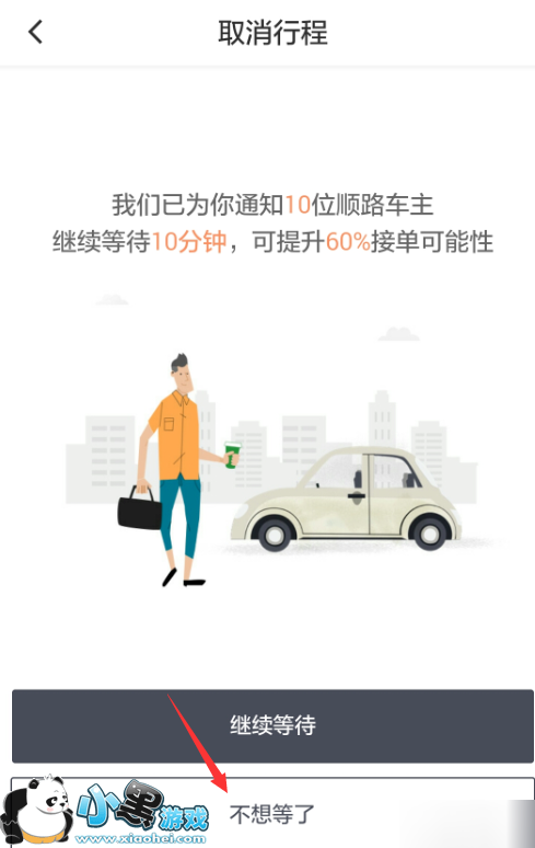 6.接着滴滴还会挽留你,告知已通知多少位顺路车主,想让你继续等待,可以直接点击“不想等了”按钮。
