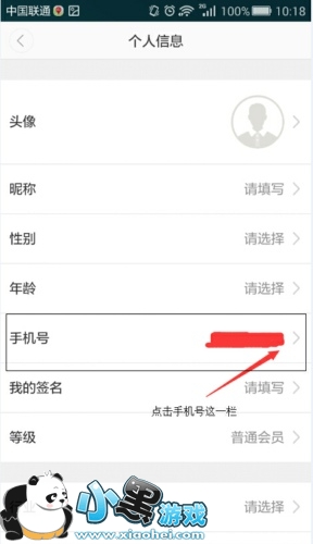 第三步:进入个人信息界面,点击手机号这一栏有灰色箭头的地方,如下图:
