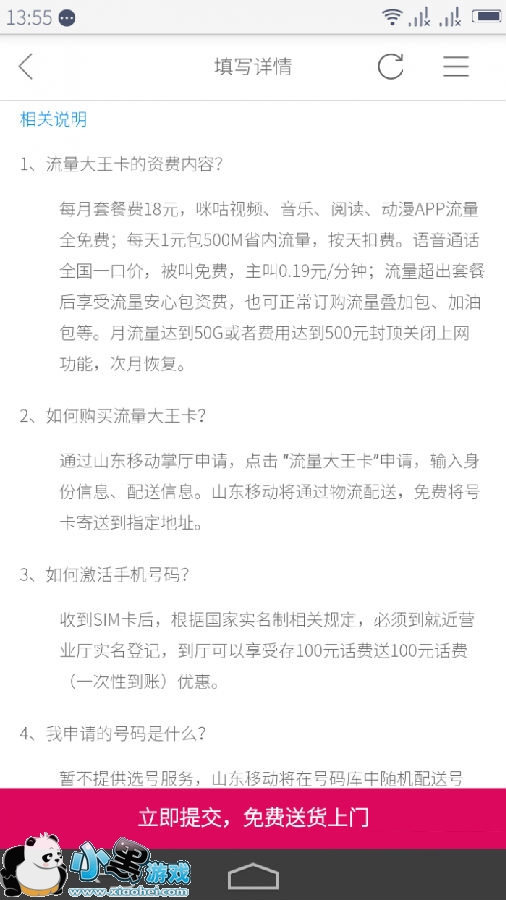 2.输入身份信息、配送信息。山东移动将通过物流配送,免费将号卡寄送到指定地址。