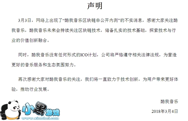 对此,酷我音乐发表辟谣声明,表示酷我音乐没有任何形式的ICO计划。