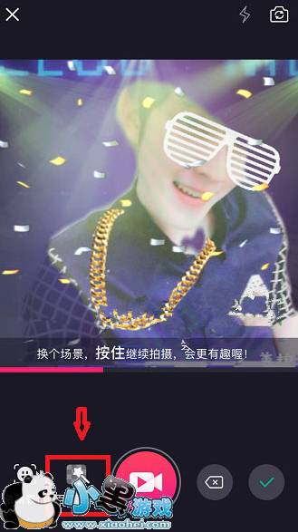 3、在拍摄界面中,按住中间的【拍摄按钮】开始拍摄,在右上角可以切换前后摄像头以及调整闪光灯,拍摄完之后点击右下角的钩就可以了。