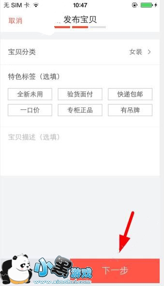 4、接着你还要选择你的宝贝分类,添加特色标签时候点击下一步!