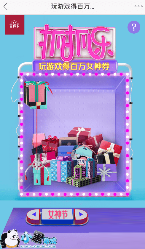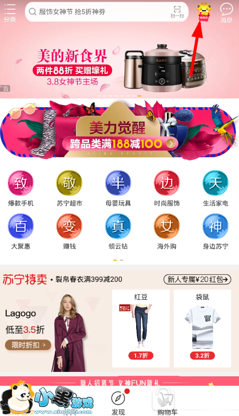 1、如果有朋友想要来参加女神节抓抓乐活动,来获取各种优惠券的话,就应该先点击主页右上角的活动按钮,进入抓抓乐活动页面。