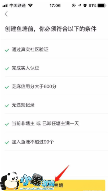 3.创建鱼塘的过程虽然是免费的,但是也还是需要我们满足一些条件,达到这些要求以后,就可以创建鱼塘了。