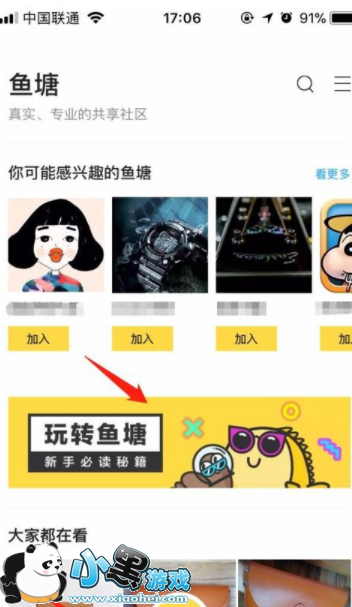 1.进入闲鱼的主页以后,我们首先在底部的选项卡上点击“鱼塘”,之后我们在该页面图示的位置,点击对应的图片。